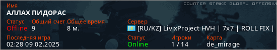 Играет на Counter Strike Global Offensive сервере. Страна: КазахстанПервый раз замечен 02:11 09.02.2025