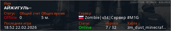 Играет на Counter Strike Source сервере. Страна: РоссияПервый раз замечен 18:48 22.02.2026