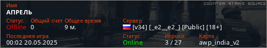Играет на Counter Strike Source сервере. Страна: РоссияПервый раз замечен 20:15 03.05.2025