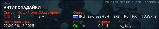 Играет на Counter Strike Global Offensive сервере. Страна: РоссияПервый раз замечен 18:30 14.11.2025