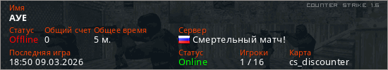 Играет на Counter Strike 1.6 сервере. Страна: РоссияПервый раз замечен 18:43 09.03.2026