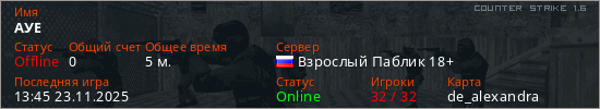 Играет на Counter Strike 1.6 сервере. Страна: РоссияПервый раз замечен 13:28 23.11.2025