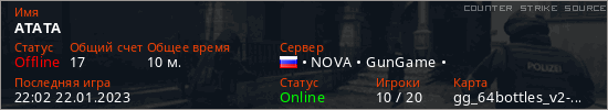 Играет на Counter Strike Source сервере. Страна: РоссияПервый раз замечен 21:56 22.01.2023