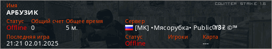 Играет на Counter Strike 1.6 сервере. Страна: РоссияПервый раз замечен 21:19 02.01.2025