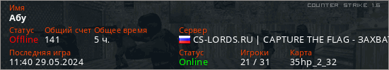 Играет на Counter Strike 1.6 сервере. Страна: РоссияПервый раз замечен 19:42 24.01.2022