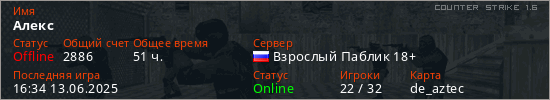 Играет на Counter Strike 1.6 сервере. Страна: РоссияПервый раз замечен 09:15 27.05.2023