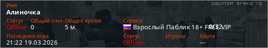 Играет на Counter Strike 1.6 сервере. Страна: РоссияПервый раз замечен 21:20 19.03.2026