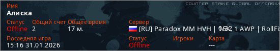 Играет на Counter Strike Global Offensive сервере. Страна: РоссияПервый раз замечен 14:14 31.01.2026