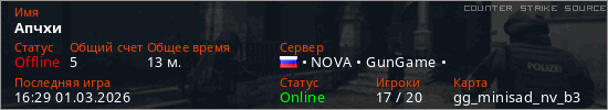 Играет на Counter Strike Source сервере. Страна: РоссияПервый раз замечен 10:20 28.02.2026