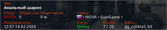 Играет на Counter Strike Source сервере. Страна: РоссияПервый раз замечен 16:06 01.02.2026