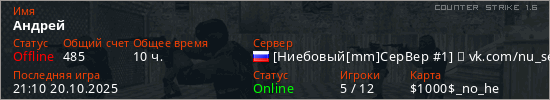 Играет на Counter Strike 1.6 сервере. Страна: РоссияПервый раз замечен 12:58 14.02.2021