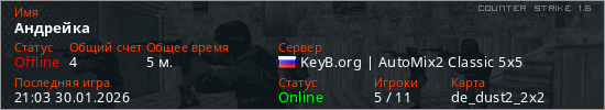 Играет на Counter Strike 1.6 сервере. Страна: РоссияПервый раз замечен 20:56 30.01.2026