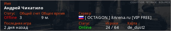 Играет на Counter Strike Source сервере. Страна: РоссияПервый раз замечен 18:44 27.01.2026