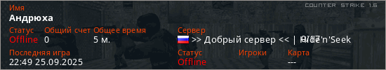 Играет на Counter Strike 1.6 сервере. Страна: РоссияПервый раз замечен 22:46 25.09.2025