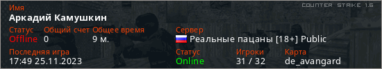 Играет на Counter Strike 1.6 сервере. Страна: РоссияПервый раз замечен 22:33 12.11.2023