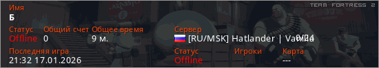 Играет на Team Fortress 2 сервере. Страна: РоссияПервый раз замечен 12:17 17.01.2026