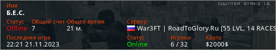 Играет на Counter Strike 1.6 сервере. Страна: РоссияПервый раз замечен 21:54 12.11.2023