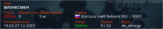 Играет на Counter Strike Global Offensive сервере. Страна: РоссияПервый раз замечен 19:01 27.12.2025