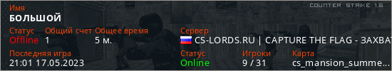 Играет на Counter Strike 1.6 сервере. Страна: РоссияПервый раз замечен 20:55 17.05.2023