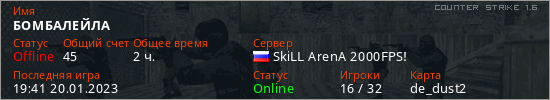 Играет на Counter Strike 1.6 сервере. Страна: РоссияПервый раз замечен 18:26 18.01.2023