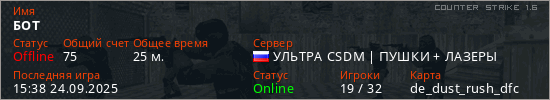 Последний раз был в сети 15:38 24.09.2025 Игрок с таким ником замечен на 35 серверах