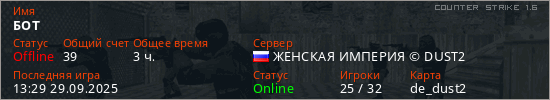 Последний раз был в сети 13:29 29.09.2025 Игрок с таким ником замечен на 35 серверах