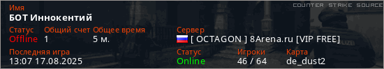 Играет на Counter Strike Source сервере. Страна: РоссияПервый раз замечен 13:05 17.08.2025