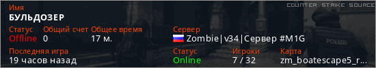 Играет на Counter Strike Source сервере. Страна: РоссияПервый раз замечен 22:14 20.07.2025