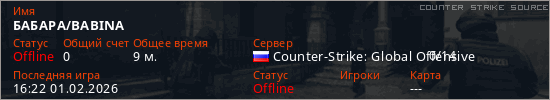 Играет на Counter Strike Source сервере. Страна: РоссияПервый раз замечен 12:37 01.02.2026