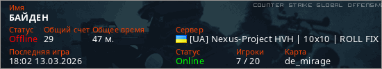Играет на Counter Strike Global Offensive сервере. Страна: УкраинаПервый раз замечен 16:58 10.03.2026