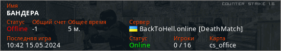 Играет на Counter Strike 1.6 сервере. Страна: УкраинаПервый раз замечен 10:36 15.05.2024