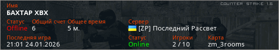 Играет на Counter Strike 1.6 сервере. Страна: УкраинаПервый раз замечен 20:59 24.01.2026