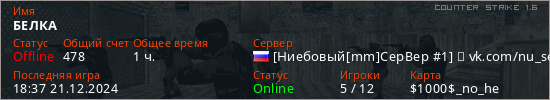 Играет на Counter Strike 1.6 сервере. Страна: РоссияПервый раз замечен 22:32 16.05.2024