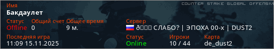 Играет на Counter Strike Global Offensive сервере. Страна: РоссияПервый раз замечен 10:50 15.11.2025