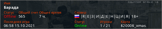 Играет на Counter Strike 1.6 сервере. Страна: РоссияПервый раз замечен 23:12 14.10.2021