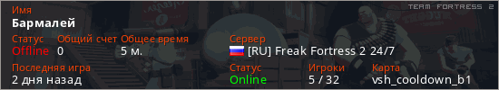 Играет на Team Fortress 2 сервере. Страна: РоссияПервый раз замечен 18:48 08.03.2026
