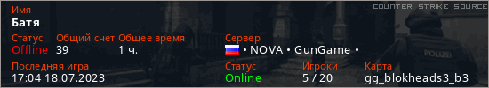 Играет на Counter Strike Source сервере. Страна: РоссияПервый раз замечен 19:41 08.10.2022