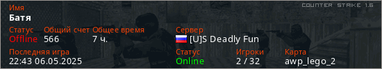 Последний раз был в сети 22:43 06.05.2025 Игрок с таким ником замечен на 41 сервере