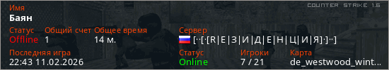 Играет на Counter Strike 1.6 сервере. Страна: РоссияПервый раз замечен 15:39 10.02.2026