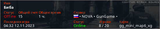 Играет на Counter Strike Source сервере. Страна: РоссияПервый раз замечен 01:42 15.07.2023