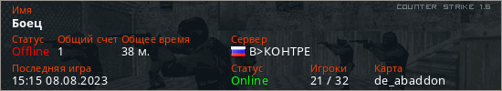 Играет на Counter Strike 1.6 сервере. Страна: РоссияПервый раз замечен 15:16 20.09.2021