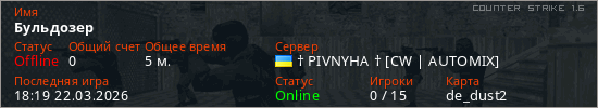 Играет на Counter Strike 1.6 сервере. Страна: УкраинаПервый раз замечен 18:15 22.03.2026