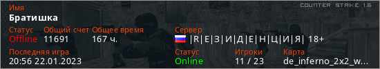 Играет на Counter Strike 1.6 сервере. Страна: РоссияПервый раз замечен 18:25 01.09.2022