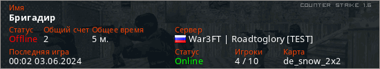 Играет на Counter Strike 1.6 сервере. Страна: РоссияПервый раз замечен 23:58 02.06.2024