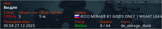 Играет на Counter Strike Global Offensive сервере. Страна: РоссияПервый раз замечен 05:45 27.12.2025