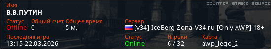 Играет на Counter Strike Source сервере. Страна: РоссияПервый раз замечен 13:12 22.03.2026
