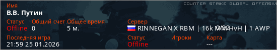 Играет на Counter Strike Global Offensive сервере. Страна: РоссияПервый раз замечен 21:43 25.01.2026