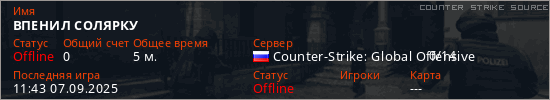 Играет на Counter Strike Source сервере. Страна: РоссияПервый раз замечен 11:33 07.09.2025