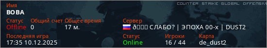 Играет на Counter Strike Global Offensive сервере. Страна: РоссияПервый раз замечен 15:29 10.12.2025