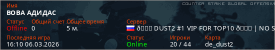 Играет на Counter Strike Global Offensive сервере. Страна: РоссияПервый раз замечен 15:55 06.03.2026
